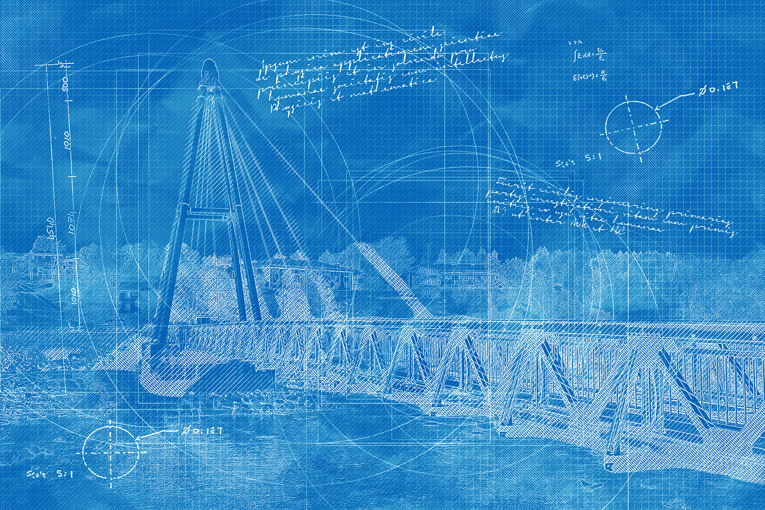 Modern Pedestrian River Cross Footbridge in Blueprint